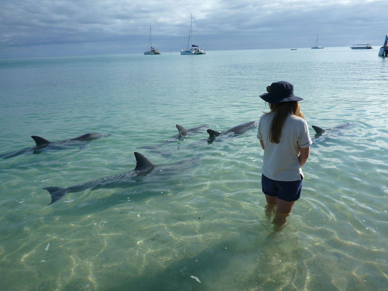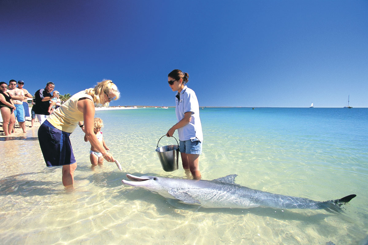 Monkey Mia, within the Shark Bay World Heritage Area, Western Australia, is an ecotourism attraction where each morning a pod of dolphins swim into shore, to mix with wading visitors and gently take fish on offer.